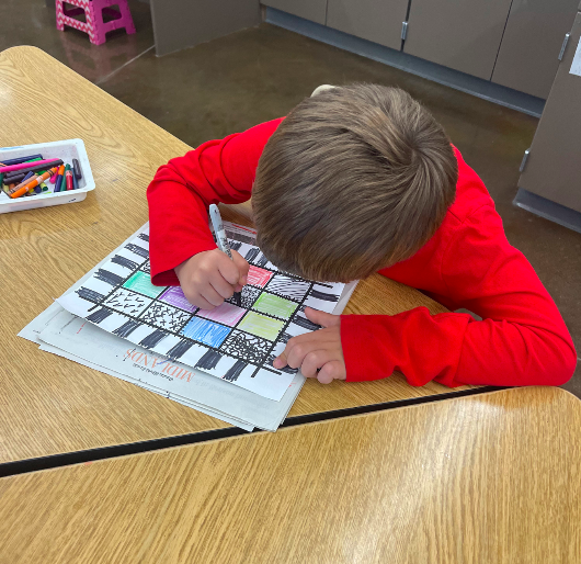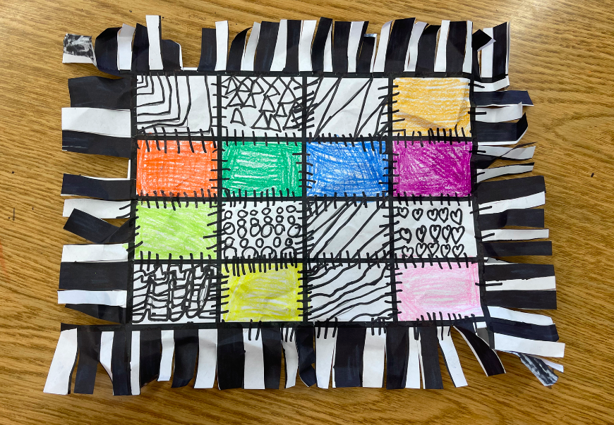 Once they are done with the inside, students decorate the outside of the paper with a repeating black-and-white pattern, and then cut with scissors to add fringe.